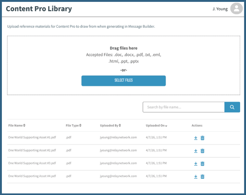 Upload assets like PDFs, emails, and PowerPoint decks. Content Pro draws from your library automatically on every generation.