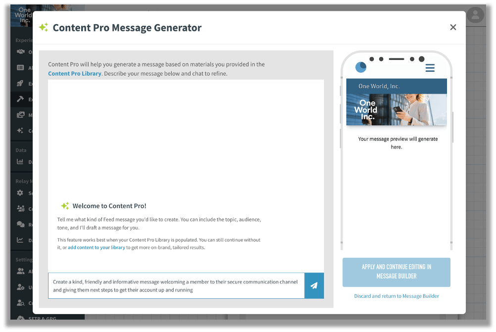 Prompt Content Pro for tone and voice. Then edit, tweak, and approve the generated Feed experiences before sending – Content Pro accelerates content creation and you’re always in control of what it creates